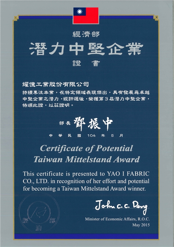 經濟部第3屆卓越中堅企業及潛力中堅企業遴選自103年6月公告受理申請,總計有162家提出申請,歷經超過半年之嚴格審查,並於104年3月23公告結果,耀億工業股份有限公司獲得「潛力中堅企業」的肯定及殊榮。